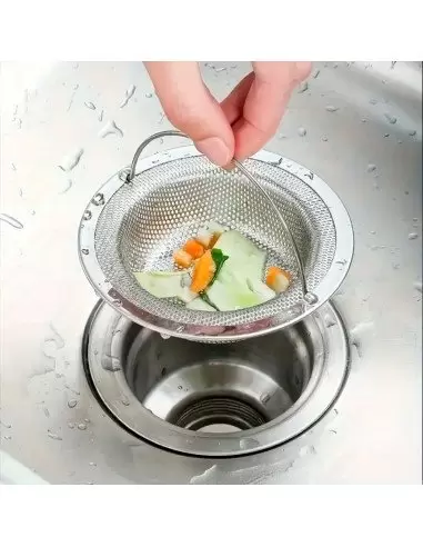 Colador de acero inoxidable diseñado para colocarse en el fregadero y atrapar restos de comida, evitando obstrucciones en la tubería.