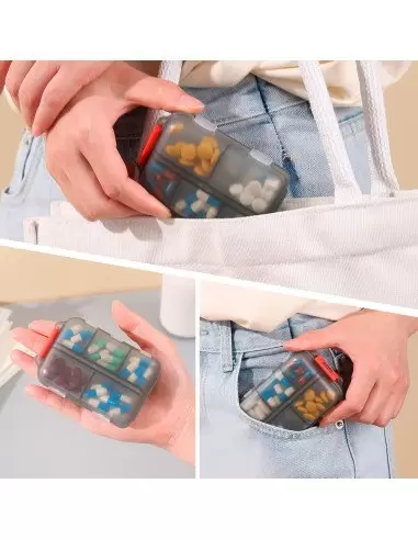 Su diseño compacto y moderno permite guardar diferentes dosis o tipos de pastillas de manera separada, ideal para uso diario o viajes.